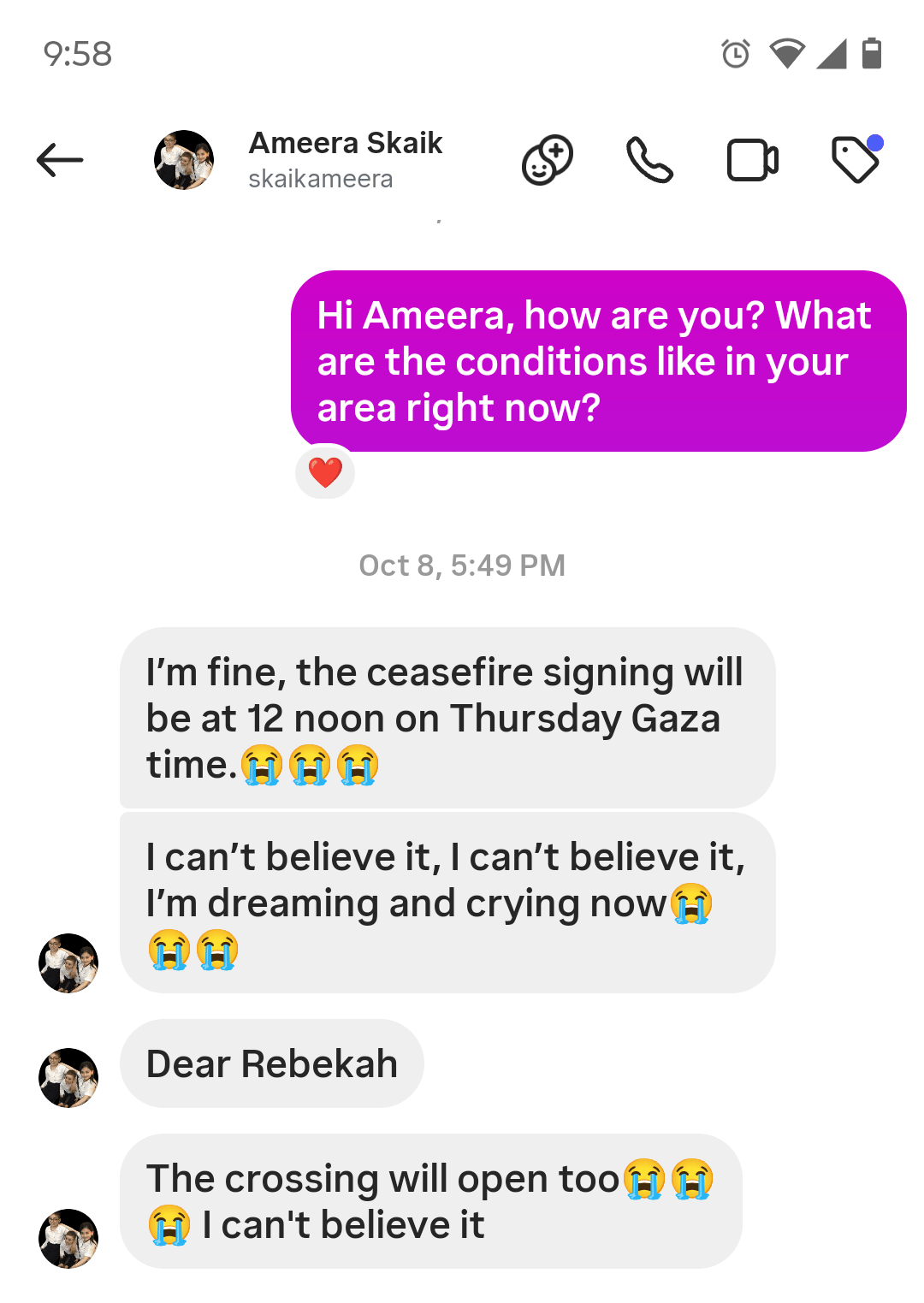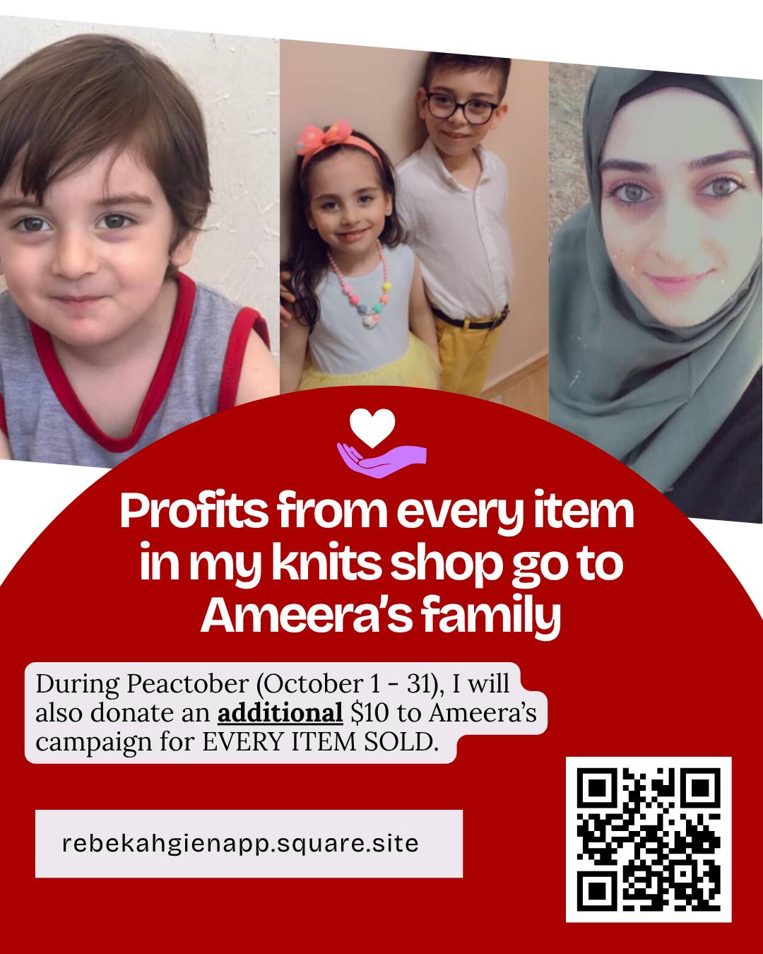 Hi Reader, The first person to tell me that the ceasefire agreement in Gaza was actually going to be signed was Ameera. (If you're new to my email list, our community has been supporting Ameera, her husband, and her three children for the past year as conditions in Gaza became increasingly horrific.) Just a week before, Ameera and her husband were trying to decide if it was too late to flee Gaza City. Every time I messaged her I was worried there might only be silence on the other end. I'm cautiously hopeful that the ceasefire will allow Ameera's family, and all families in Gaza, respite from violence. During January's ceasefire, as some aid was allowed in, food prices began to go down. I'm hopeful that Ameera will be able to buy more with the donations she receives, and that malnutrition will no longer be her family's daily reality. But I'm also aware of all that she has lost and how impossibly big a task it is for her family to begin again. Their home was completely destroyed during the war. They've had to flee repeatedly and lost so many of their posessions. Winter weather will soon be here, and Gaza's infrastructure in large part no longer exists. As a Coffees for Gaza volunteer (CFG is the small but might mutual aid group that I met Ameera through), I worry that the headlines might fade and people could forget our families. I worry that the world, especially the U.S. who gave Israel $21 billion in military aid for this war, will ignore the moral imperative to justly rebuild Gaza. Peace without justice is not peace. The absence of overt violence, by itself, it not peace. Those are huge concerns that are outside of my control. So I'm reminding myself of what I CAN do. 1) I can keep up the pressure on elected officials. (If you're not already connected with an activist organization, American Friends Service Committee is my go to resource for advocacy for Palestine). 2) I can continue my knitting fundraiser for Ameera's family. Because this month is Peacetober, I'm donating an additional $10 per item purchased to Ameera's family. (All the profits from knits sales already go to Ameera, so this is an extra bonus!)
