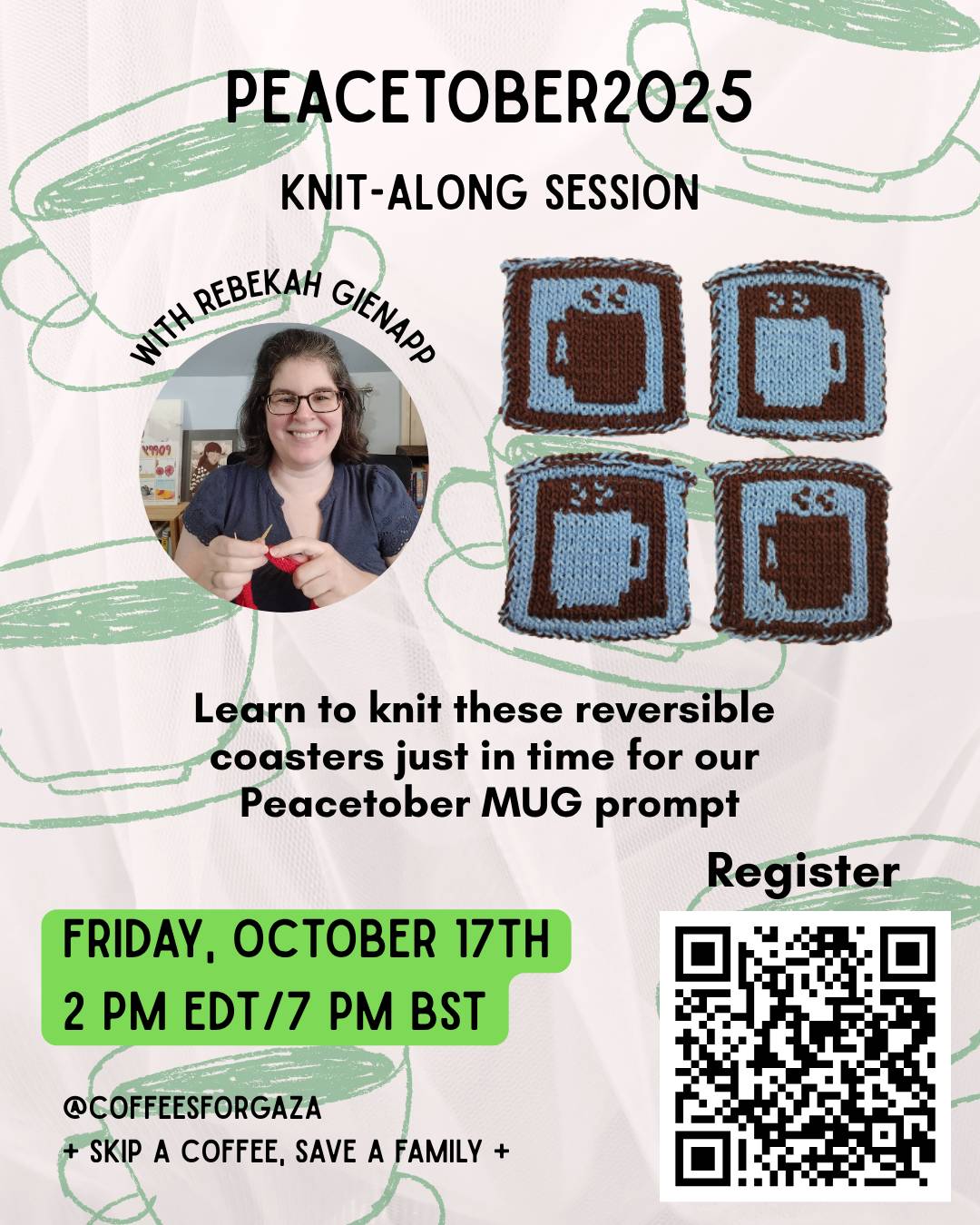 3) I can keep up my work with Coffees for Gaza and keep inviting others to join us. Coffees for Gaza is an all-volunteer collective of artists and creatives that encourages micro-donations to 25 families in Gaza. You can sign up for our email newsletter here (written by me, so I think it's a pretty useful resource 😉) or follow us on Instagram here (right now it's full of inspirational Peacetober art.) And if you're a knitter, I'm hosting a knit-along for Coffees for Gaza this Friday. Check out the details or register here. xo, Rebekah Rebekah Gienapp (she/her/hers) | rebekahgienapp.com | Connect on Instagram | Coffees for Gaza | |